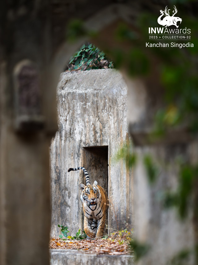 Riddhi, marking her territory at Khemka Kund, Ranthambore. It was my luckiest day because I spent more than half an hour in her presence as she walked through zone 2. While walking on the road she decided to climb the kind wall and appeared through this door giving me a beautiful shot.