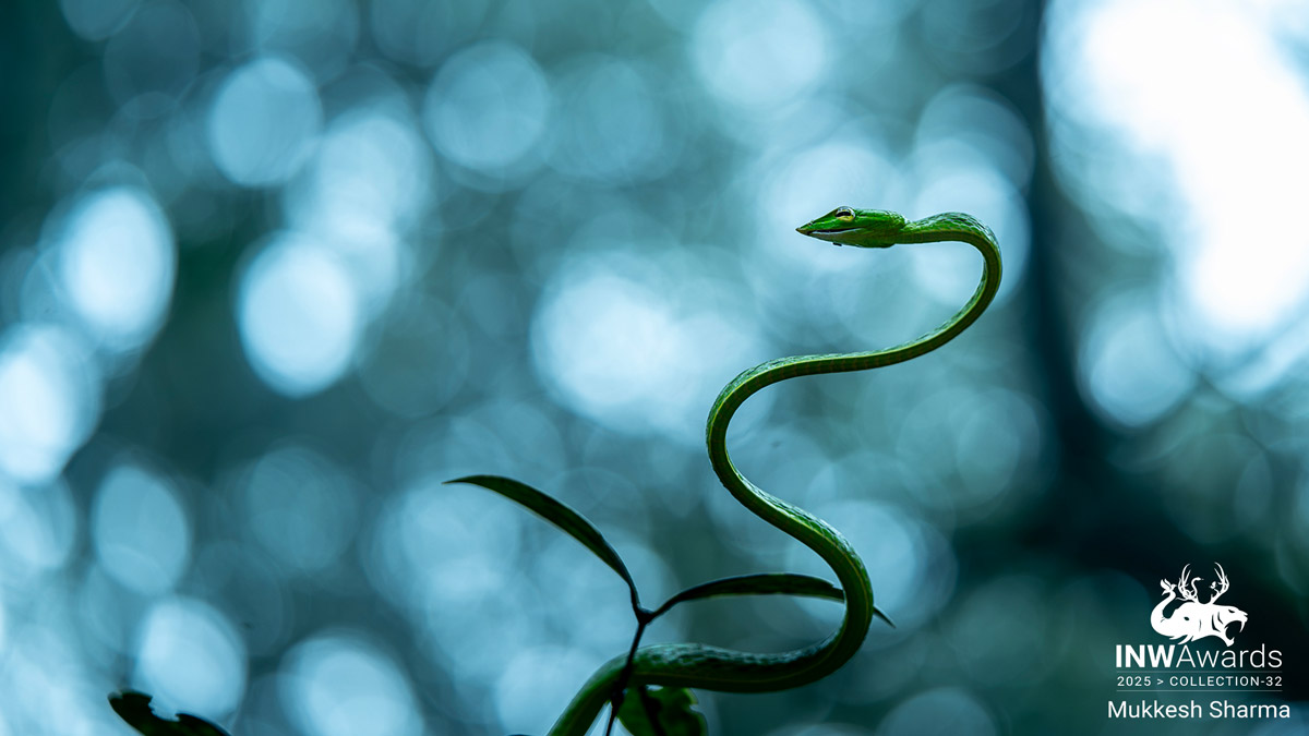 The Silent Arrow of the Forest In the emerald silence of the rainforest, where moss carpets ancient trees and mist linger like a veil, a slender figure emerges — the Green Vine Snake. In this photograph, the snake glides effortlessly along moss-laden branches, its form almost vanishing into the foliage, until only its piercing emerald eyes betray its presence. The Green Vine Snake (Ahaetulla nasuta) is a master of stillness and deception. With its narrow, whip-like body and cryptic green scales, it sways gently with the breeze, mimicking vines and branches. This behavior is not just camouflage, but survival — a strategy to remain unseen by both predator and prey. This snake is child of the rainforest canopy, thriving in the wet, evergreen forests of the Western Ghats. In this frame, captured against the misty blue-green tones of the forest, the Green Vine Snake embodies elegance and patience. Its poised body, resting on a mossy trunk, stretches forward like an arrow drawn in silence — a portrait of nature’s artistry where beauty and predation are one. This image is not just of a snake, but of a forest spirit — a reminder that in the stillness of the wild, there are stories unfolding in whispers, waiting to be seen.