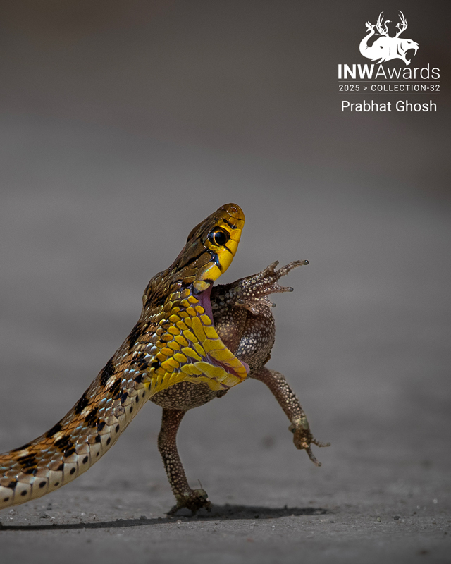 “Struggle for Survival” In a rare and intense moment from the wilds of Rajarhat, a snake is seen mid-hunt, tightly gripping its amphibian prey. The detailed texture of the scales and the dramatic struggle between predator and prey showcase the raw reality of nature’s food chain. Captured with perfect timing, this image reveals the untamed beauty and survival instinct of the wild.