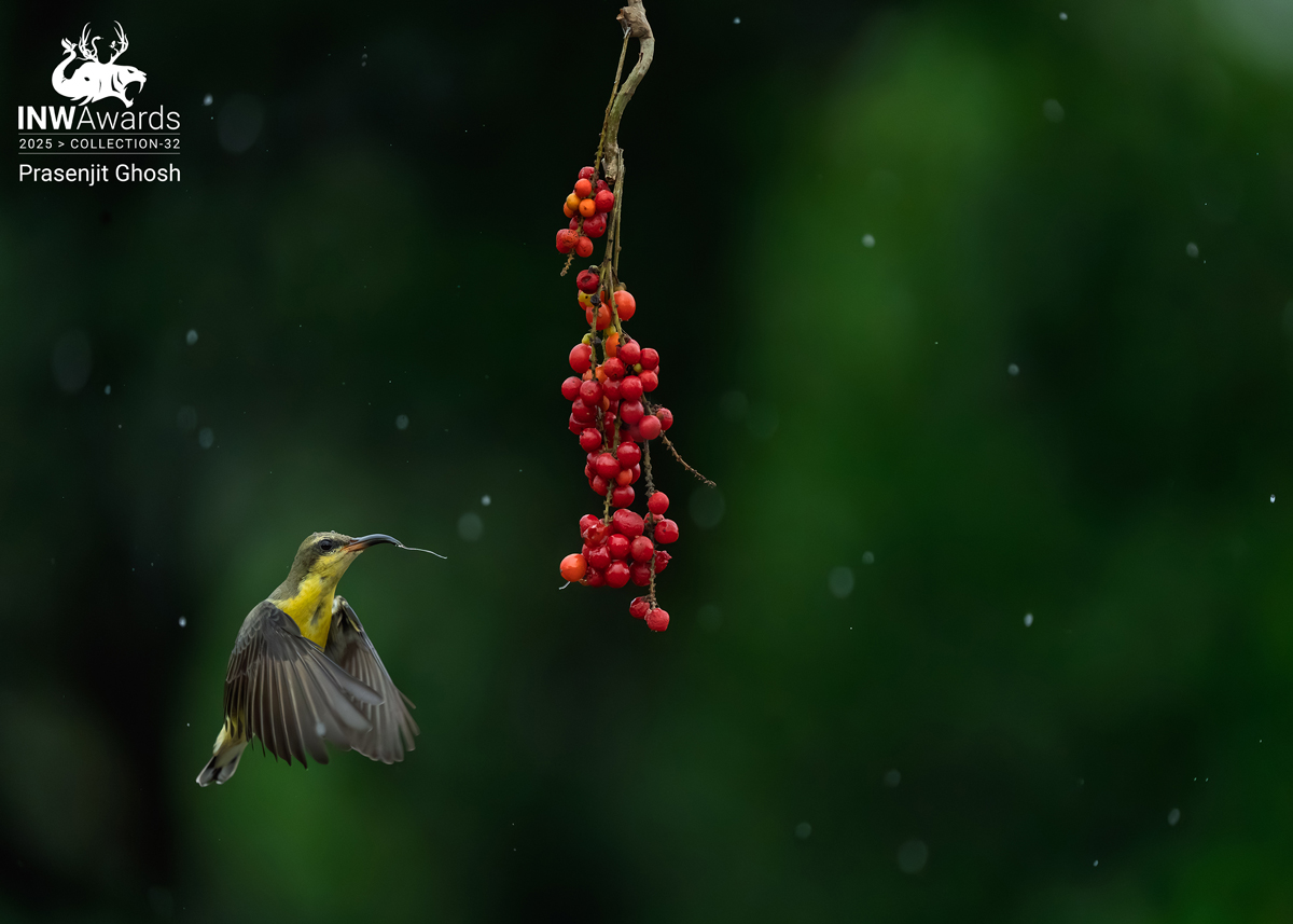 In the gentle rhythm of the monsoon, a tiny sunbird perched delicately on a berry-laden branch, its feathers shimmering under drifting raindrops. Each drop rolled off its iridescent plumage like liquid jewels, catching flashes of blue and gold in the muted light. As the berries glistened with fresh rain, the sunbird hopped lightly between them, sipping sweetness with its slender curved bill. In that brief, magical moment, nature felt still—just the soft patter of rain, the sparkle of ripe fruit, and the graceful silhouette of a sunbird celebrating the simple beauty of a wet morning. Location- Madanpur (Nadia District) Date of Click- 30/10/2025