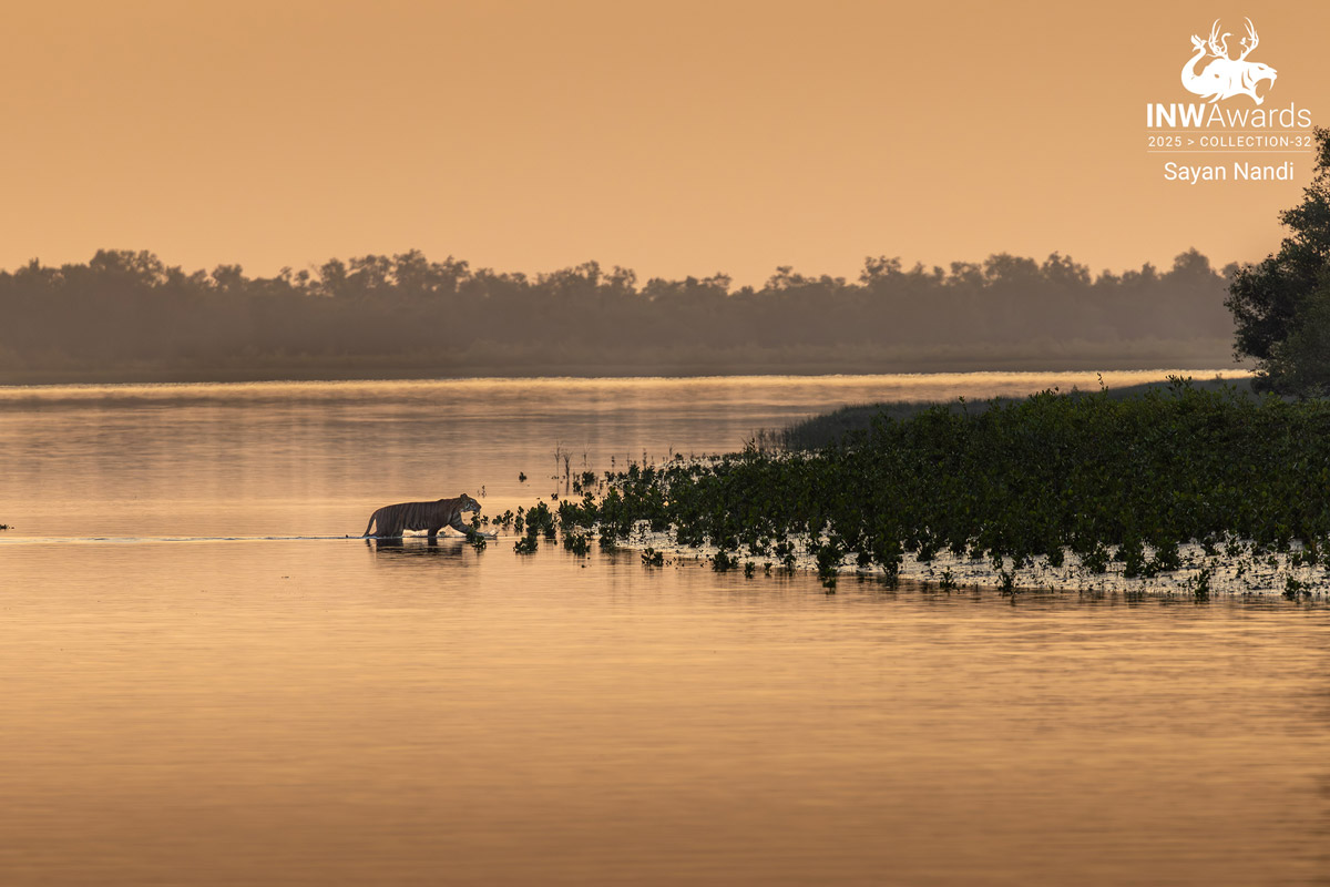 Maternal Journey at Dusk A golden twilight envelops the Sundarbans as tigress Boroma wades through shallow waters, her powerful form silhouetted against the misty horizon. Captured in November 2025, this moment freezes her solitary crossing between mangrove islands—a mother's determined journey to reunite with her two subadult cubs waiting on the far shore. The ethereal glow of dusk and rising mist transform this routine passage into a portrait of wilderness intimacy, revealing the delicate balance between strength and devotion in one of the world's most elusive apex predators.