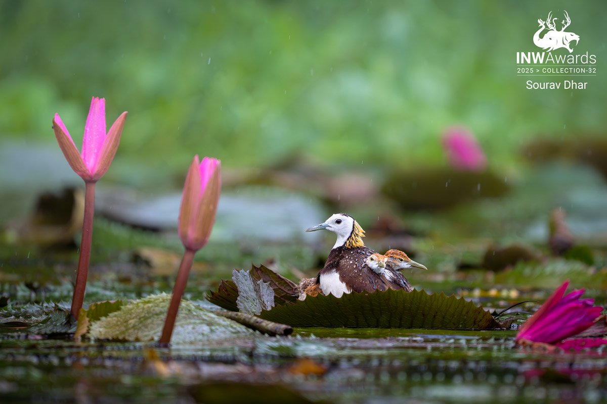 To shield his young Jacana chicks from the sudden downpour, the father lowers himself gently, tucking them safely beneath his wing. The surrounding water lilies and falling raindrops add a poetic touch to the scene. Picture taken on July 2025 at Kobla, West Bengal.