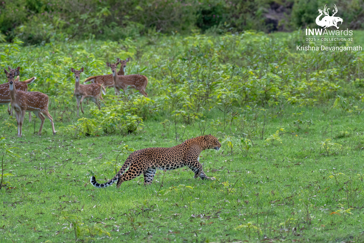 Calm beast Out in the open meadows of Bandipur National Park, this moment unfolded so quickly that I almost didn’t believe my own eyes. We had just rounded a bend when the alarm calls echoed through the forest—sharp, urgent notes from the chital. That’s when I spotted him: a leopard stepping out of the lantana thickets, calm and confident, as if he owned every inch of that clearing. I kept the vehicle still and lifted my camera without making a sound. The key was to anticipate his path, not chase it. The chital herd froze behind him, their eyes wide and alert, creating a natural tension in the frame. I wanted to show that story—predator and prey sharing the same space, each fully aware of the other. I framed wide to include both the leopard in motion and the chital watching from the background. The light was soft, filtered through Bandipur’s monsoon clouds, helping bring out the rich greens of the meadow and the leopard’s striking coat. All I had to do was wait for that perfect stride—head low, muscles coiled, tail balanced. One press of the shutter, and the whole drama of Bandipur’s wild heart came together in a single frame.