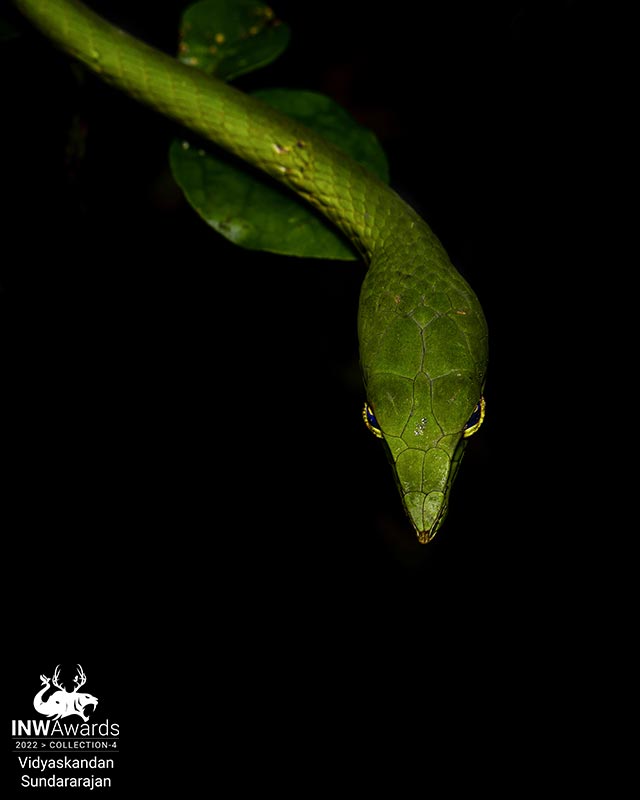 Common Vine Snake slithering from branch to branch probably preparing for the hunt. It was amazing to watch this incredible species as it was around the same bush for the whole of the day time and camouflaged with the greeneries of this Rainforest at Agumbe in Westen Ghats.