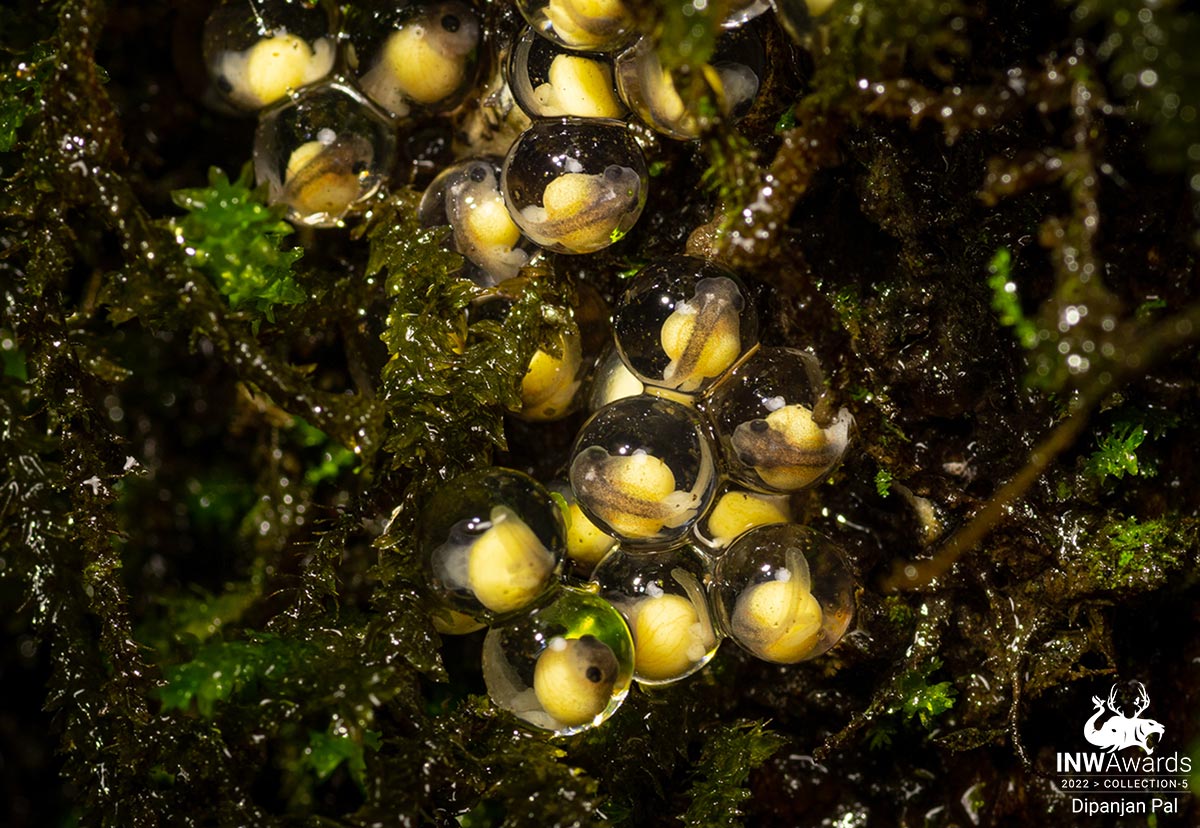 Marbled Spawns like frog Embryos on the branch of a tree at Amboli of Western Ghats. It was very difficult to get closer to them without making any harm in dark evening and inside heavy rain.