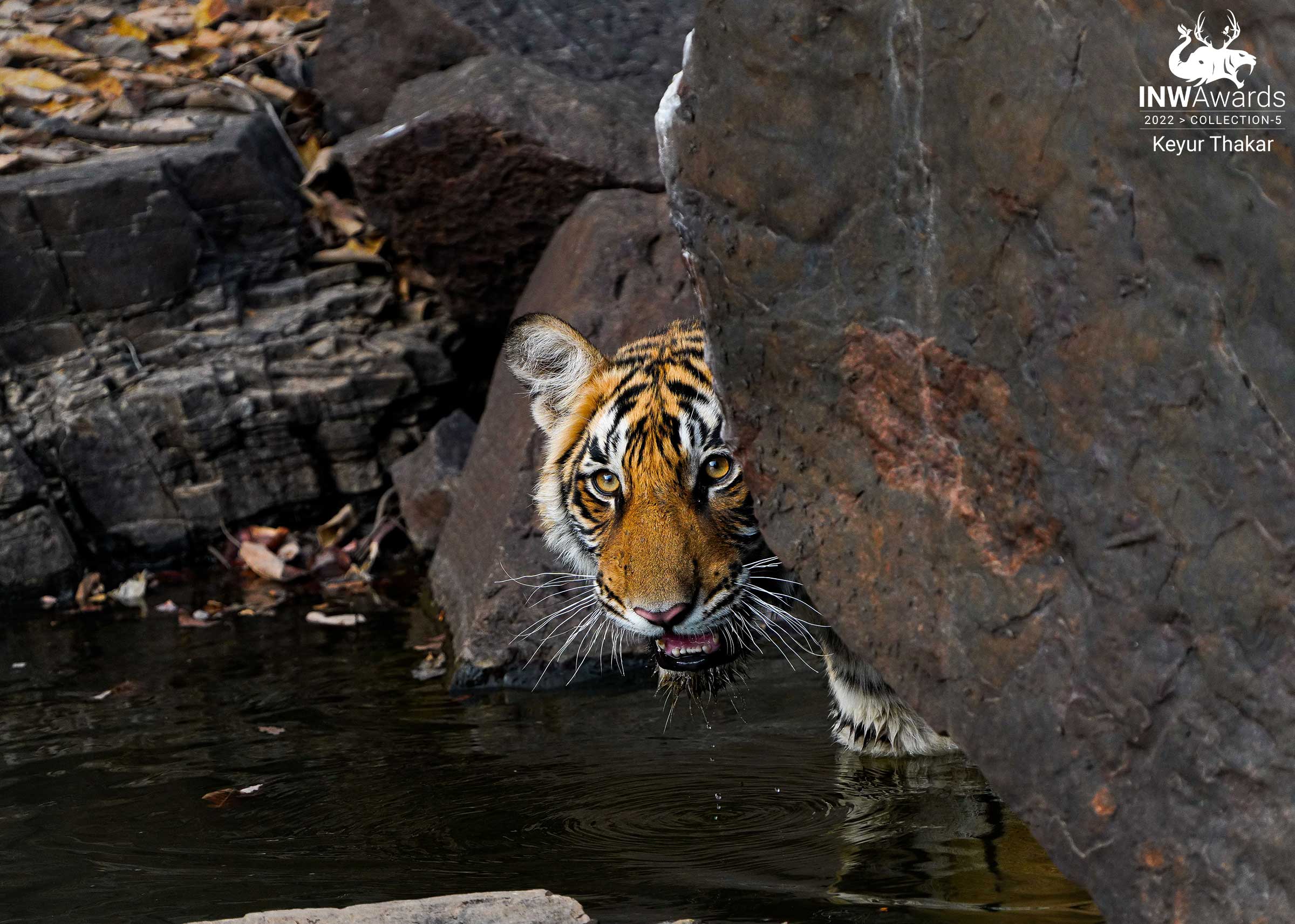 Come let's play hide & seek We were at Ranthambore Tiger Reserve during our safari on hot summer day. We were rushing towards a watering hole which is a usual domain ground for tiger. suddenly on our road journey towards watering hole we spotted something that was T111 with her 3 Cubs walking towards watering hole, So I chased them till the last. This picture was taken there where the mother tigress was drinking water, 2 Cubs were playing around and 1 of her Curious Cub was drinking water behind the rock.
