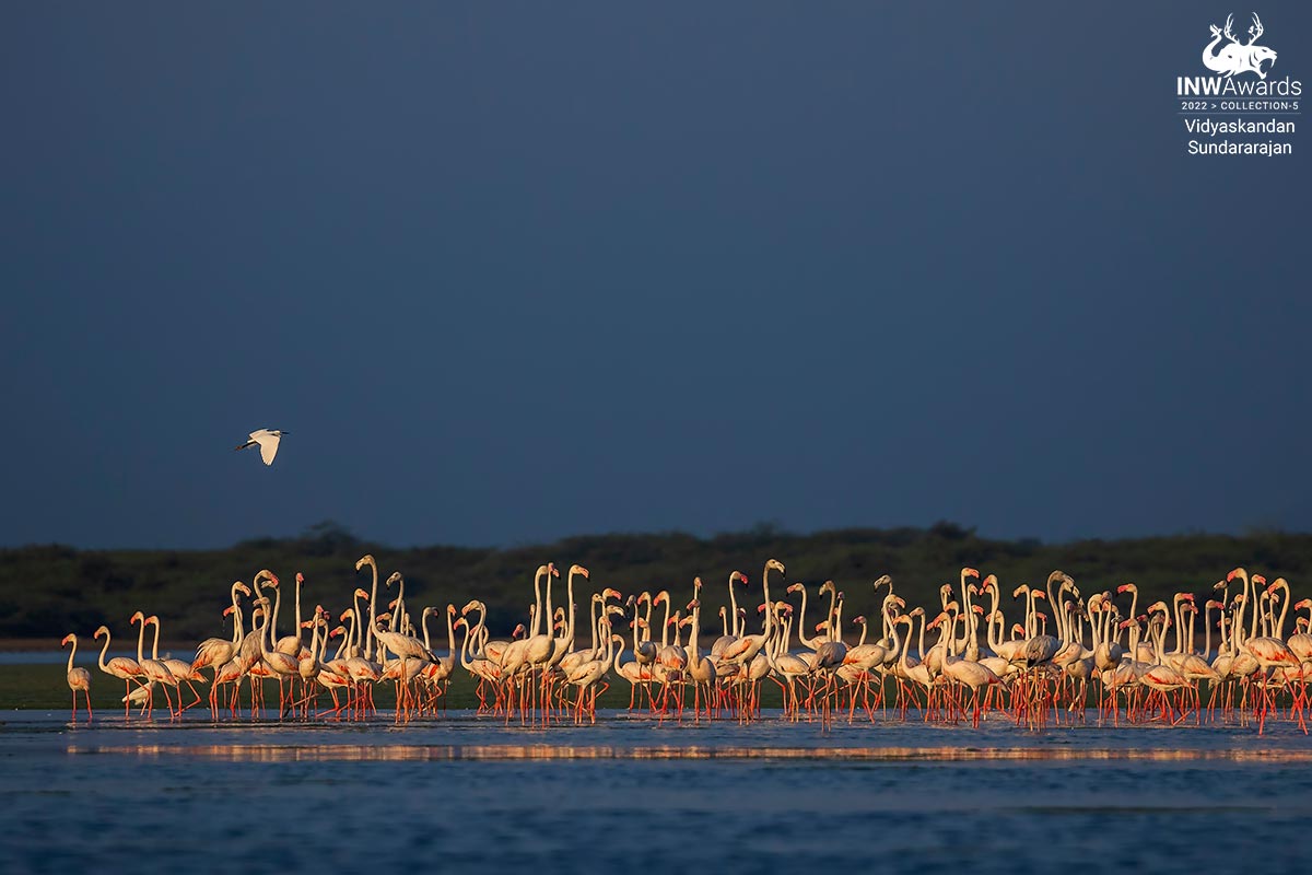 A Flamboyance of Greater Flamingos gathered at Pulicat- Second largest Brackish water lagoon in the India located at northeast side of Tamil Nadu. This image was capture during February 2022 when these birds migrate to this place. Initially every single one in the group was busy feeding and getting its head into the shallow water. A little while later, something got their attention as they all stopped feeding and raised their long neck uniformly to look around.