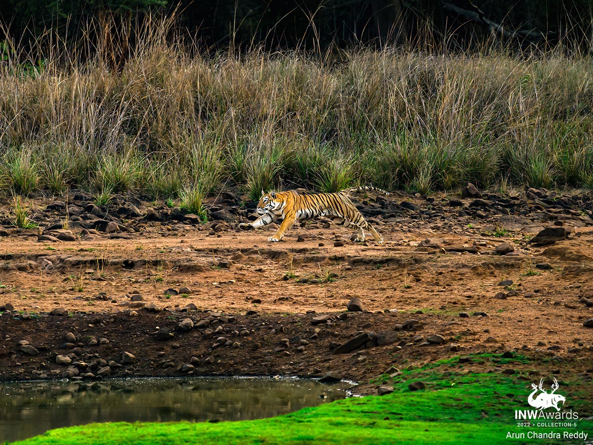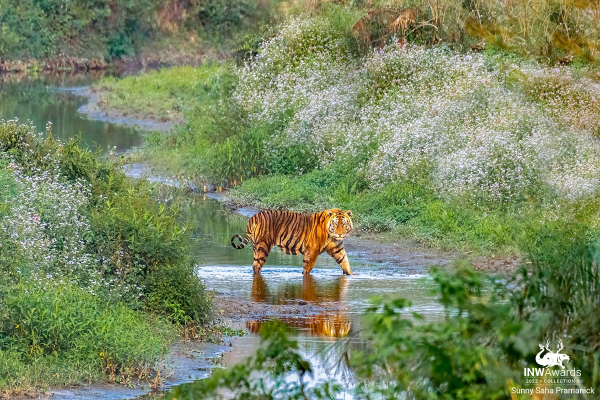 This image was taken in Kaziranga National park. It was a thrilling experience. We waited on a bridge for 45 minutes after hearing alarm calls. We anticipated that the tiger will come out of the forest and cross the river and he did. Our patience paid out.
