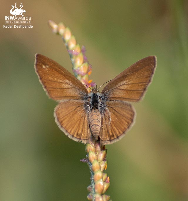 Closeup shot of a butterfly. I was roaming around outskirts of my city, looking for some birds. It's wings were closed When I saw this tiny butterfly. Knowing that the butterfly might open its wings or basking, I sat there patiently for 4-5 minutes. After this period its started walking on that grass strand and it opened up its wings and stayed like that for 1-2 minutes. After this it again closed its wings and just sat on that grass strand. Shot on Nikon D3500