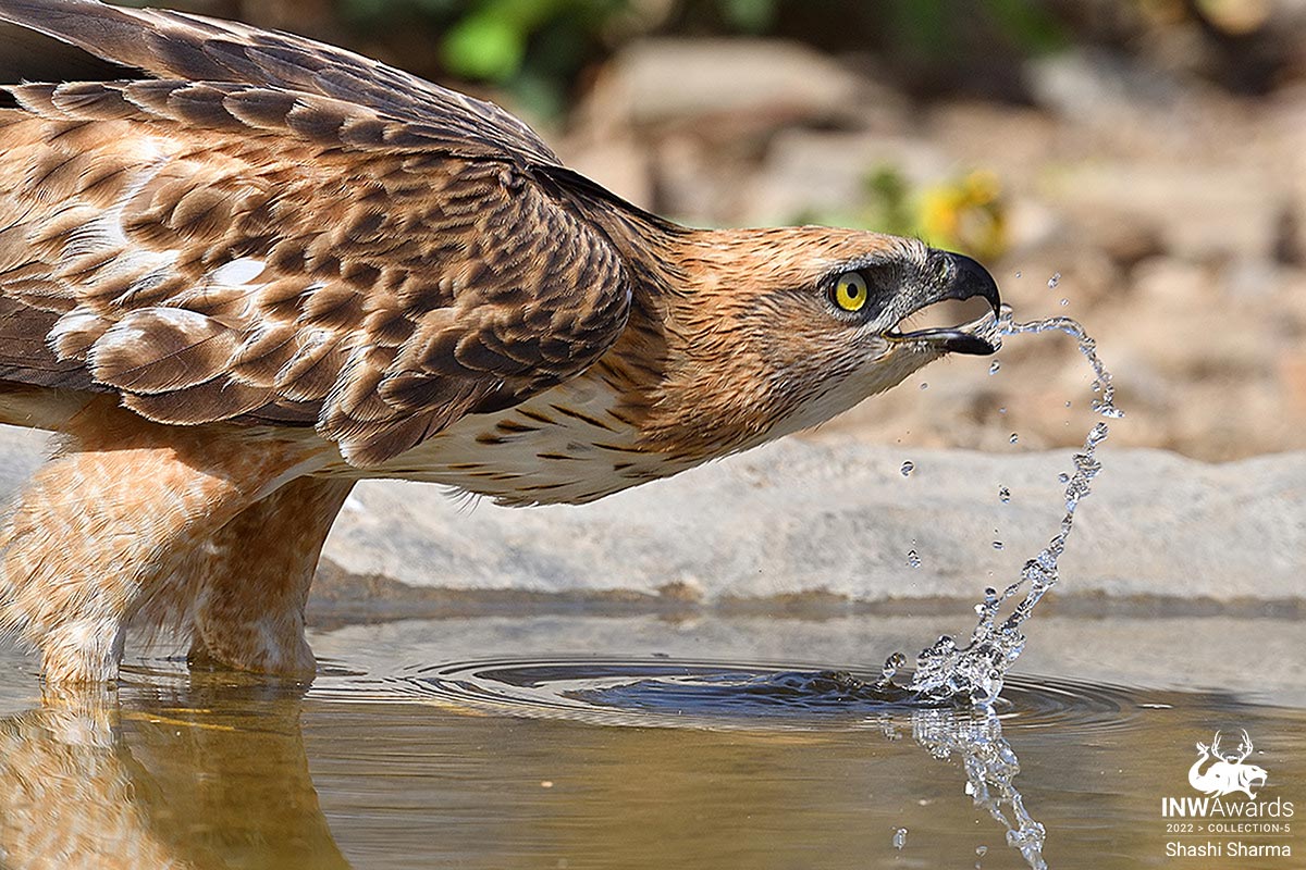 Pali is facing severe heat wave and water scarcity these days. In these tough times, water is being provided by the forest department for wildlife. At some distance from one such hole, I setup my tent before sunrise and sat inside it with my camera. With passing the day, movements of birds started toward the waterhole. I was enjoying their activities and kept taking pictures. Suddenly a crested hawk eagle landed on a nearby tree. I was overwhelmed to see it as it was my long awaited lifer. I waited patiently for it to come down at waterhole. While I captured the thrilling moment I had to control my nerves.