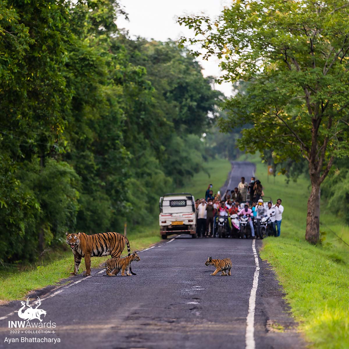 Mom & Us : A female tigress crossing the Chandrapur Mohurli main road along with her cubs in Tadoba Andhari Tiger Reserve.
