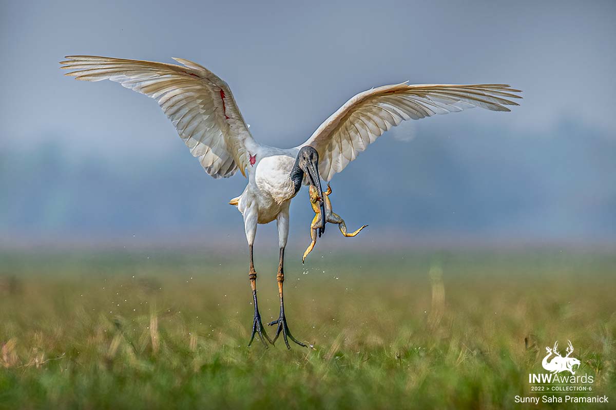 The black headed Ibis just got a frog and saw one Brahminy Kite was coming towards it, so decided to fly with the frog and I took this shot at that very moment. This was taken in Mangala Jodi, Odisha.