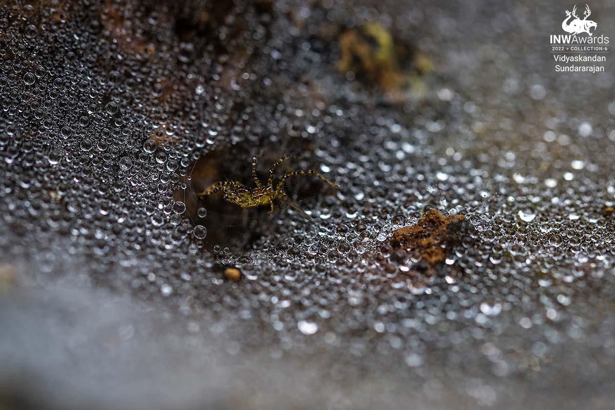 Cobwebs are commonly seen on forest floors during the morning hours before harsh Sun. These dews form a beautiful layer on the web that shine like diamonds under the early morning lights. Like any other web, this is home as well as trap to spiders. This image is one of such web woven around a burrow by a Funnel Web Wolf Spider. The reflection of dews on each other with the very contrasting ground is what adds more beauty to these webs.