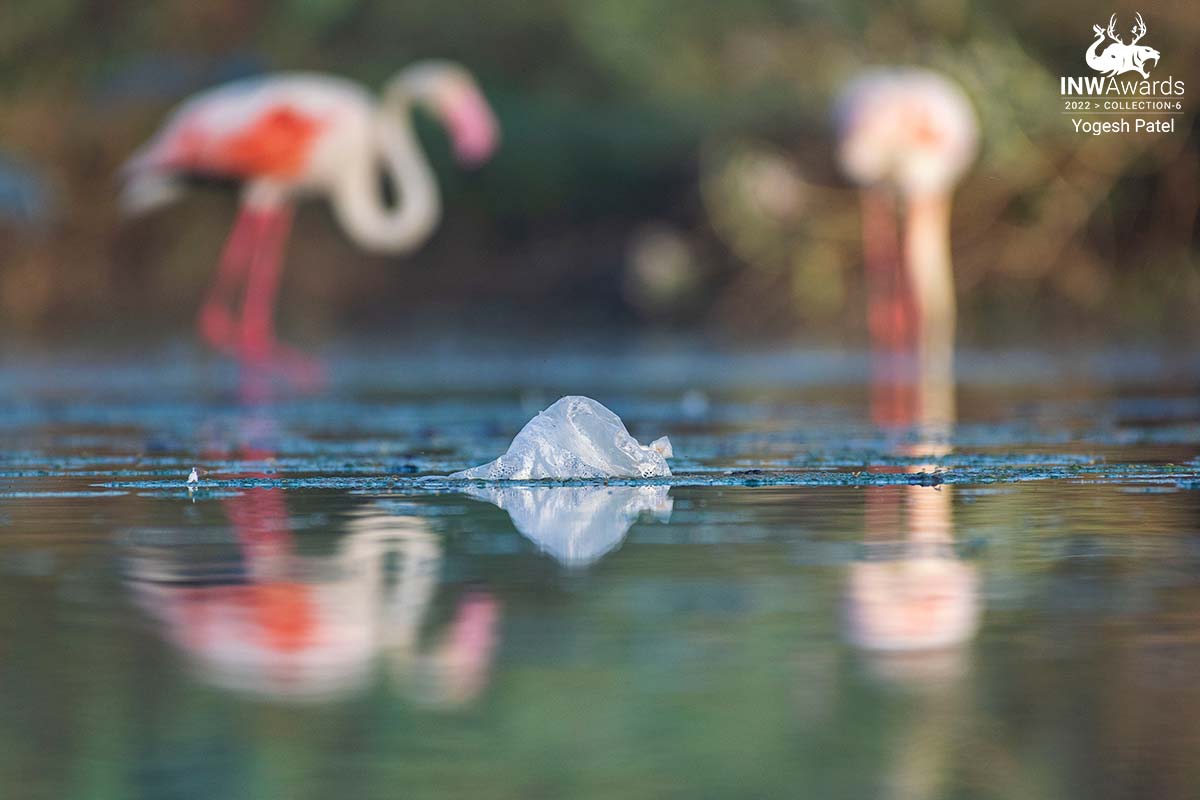 Planet or Plastic choose planet, not plastic. Greater Flamingo feeding in morning light, the waterbody is having plastic pollution. click at outskirts of Ahmedabad. Nikon D3300(200-500 Nikkor)