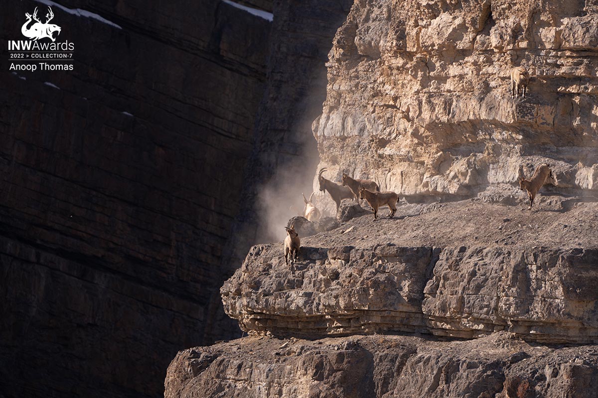 Stampede at 14000ft Himalayan Ibexes running on the steep rocky mountains puffing up dust while doing so after being chased by a feral dog.