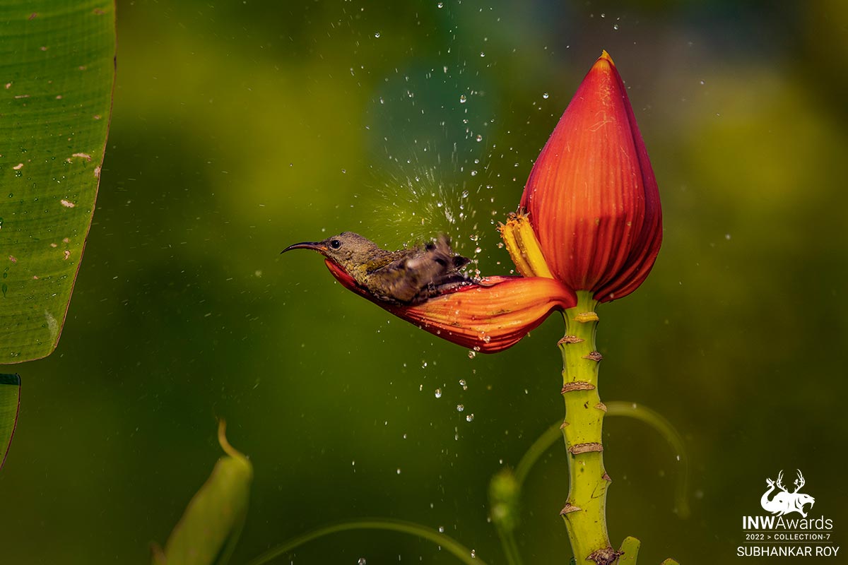 This place in Coochbehar district of West Bengal being quiet and contained fruit-trees is full of variety of bird-species. While roaming around the place, I found some banana trees where sunbirds were chirping. Butterflies were also coming on the Banana Flowers/ blossoms. It was sunny afternoon; I waited there and found this female purple sunbird taking dips on this floral bathtub to beat the heat to cool itself. Generally, it is often seen that the birds recharge themselves towards the end of a day by taking bath in a small pool of stagnant rainwater stored on petals, potholes etc.