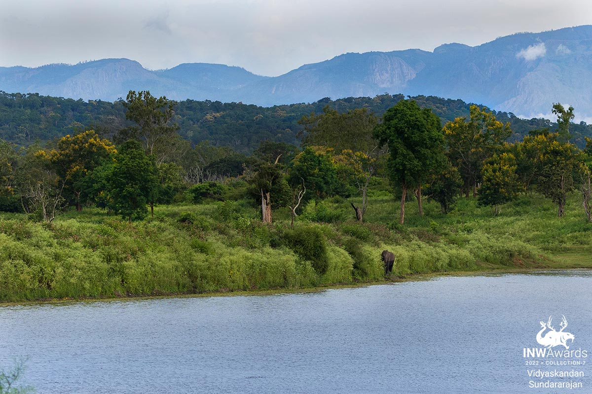 A lonely elephant visiting the water body to quench its thirst. This image was captured at Bandipur Tiger Reserve. The flora and fauna of the forest is best witnessed during the monsoon period. The various layers formed by water body, tall grass, thick forest tress, beautiful Nilgiri mountains at the backdrop and cloudy skies give life to this image. Even the giant of the forest looks tiny in such vast scape.